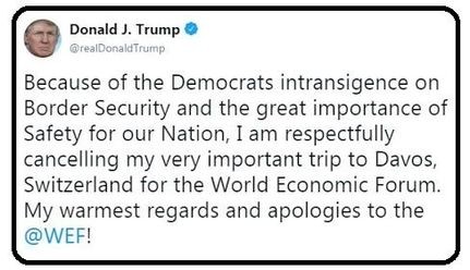 Tramp, "Demokratların, sərhəd təhlükəsizliyi və millətimizin təhlükəsizliyinin əhəmiyyətinə dair barışmazlığına görə, Dünya İqtisadi Forumu üçün İsveçrənin Davos Şəhərinə edəcəyim səyahəti hörmətlə ləğv edirəm",- mesajında qeyd etmişdi.