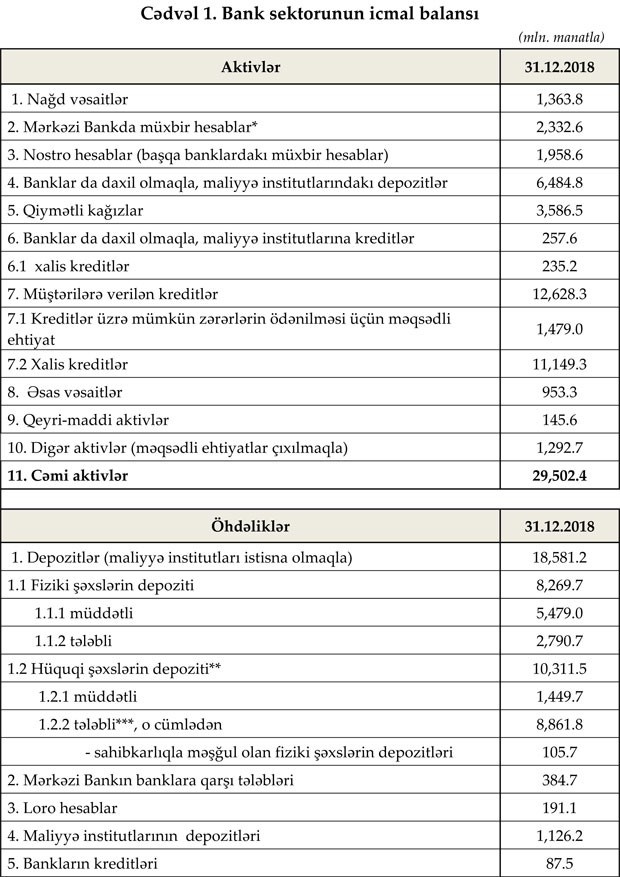31 dekabr 2018-ci il tarixinə Azərbaycanda fəaliyyət göstərən bankların cəmi aktivləri 29 milyard 502.4 milyon manat, cəmi öhdəlikləri isə 25 milyard 430.6 milyon manat təşkil edib.