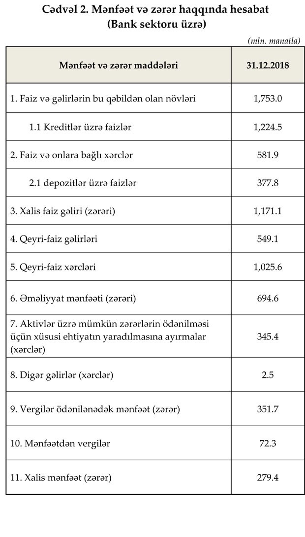 2018-ci ili bank sektoru mənfəətlə başa vurub. Banklar 694.6 milyon manat əməliyyat mənfəəti, 279.4 milyon manat məbləğində xalis mənfəət generasiya edib.