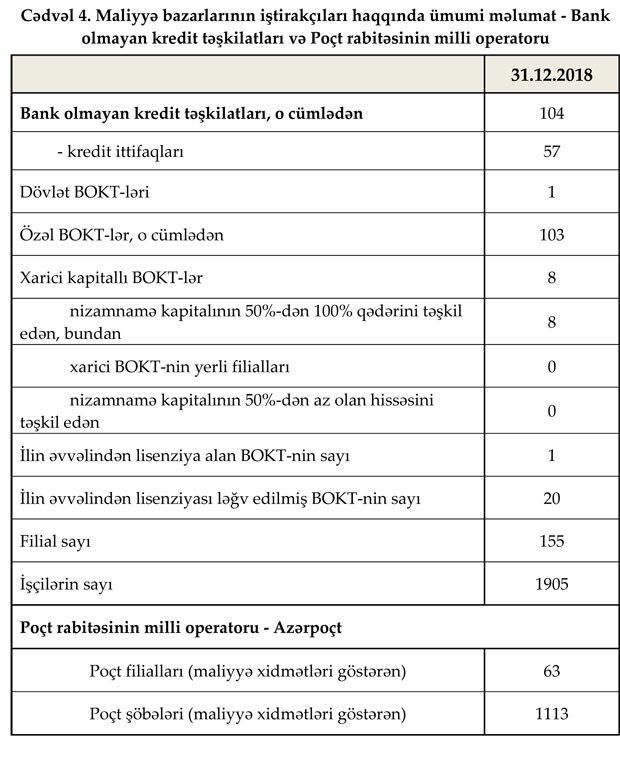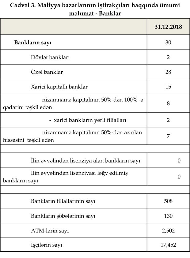 Fəaliyyət göstərən 30 bankın filiallarının sayı 508, şöbələrinin sayı 130, ATM-lərin sayı 2,502 olub. Bank sektorunun işçi heyətinin artım trendi dekabr ayında da davam edib. Belə ki, dekabrda işçi sayı 0.5% (94 nəfər) artaraq 17 415 nəfər təşkil edib. Ümumilikdə isə 2018-ci ildə bank sektorunda çalışanların sayı 7.7% (1 244 nəfər) artıb.
