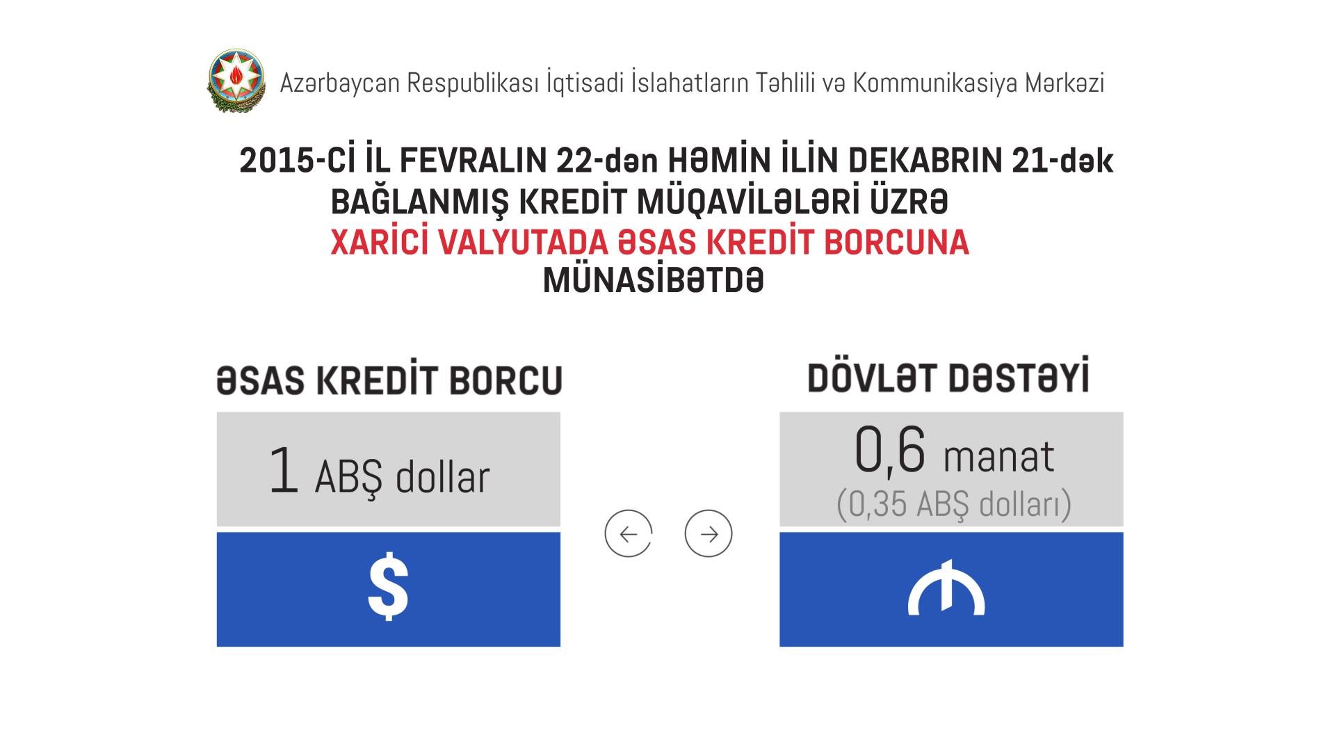 Prezident İlham Əliyevin Fərmanını şərh edən İqtisadi İslahatların Təhlili və Kommunikasiya Mərkəzinin icraçı direktoru Vüsal Qasımlı bildirib ki, dövlət dəstəyini müəyyən etmək üçün 2015-ci il fevralın 21-i və dekabrın 21-i tarixləri, başqa sözlə, məzənnə dəyişdiyi tarixlər əsas götürülüb: “2015-ci il fevralın 21-nə xarici valyutada mövcud olan əsas kredit borcuna münasibətdə – 1 ABŞ dollarına 0,25 manat (0,15 ABŞ dolları) və 2015-ci il fevralın 22-dən həmin ilin dekabrın 21-dək bağlanmış kredit müqavilələri üzrə xarici valyutada əsas kredit borcuna münasibətdə – 1 ABŞ dollarına 0,6 manat (0,35 ABŞ dolları) kimi qiymətləndirmə olacaq. 2015-ci il fevralın 21-nə və dekabrın 21-nə mövcud olmuş xarici valyutada əsas kredit borclarına hər iki qayda tətbiq olunur.”