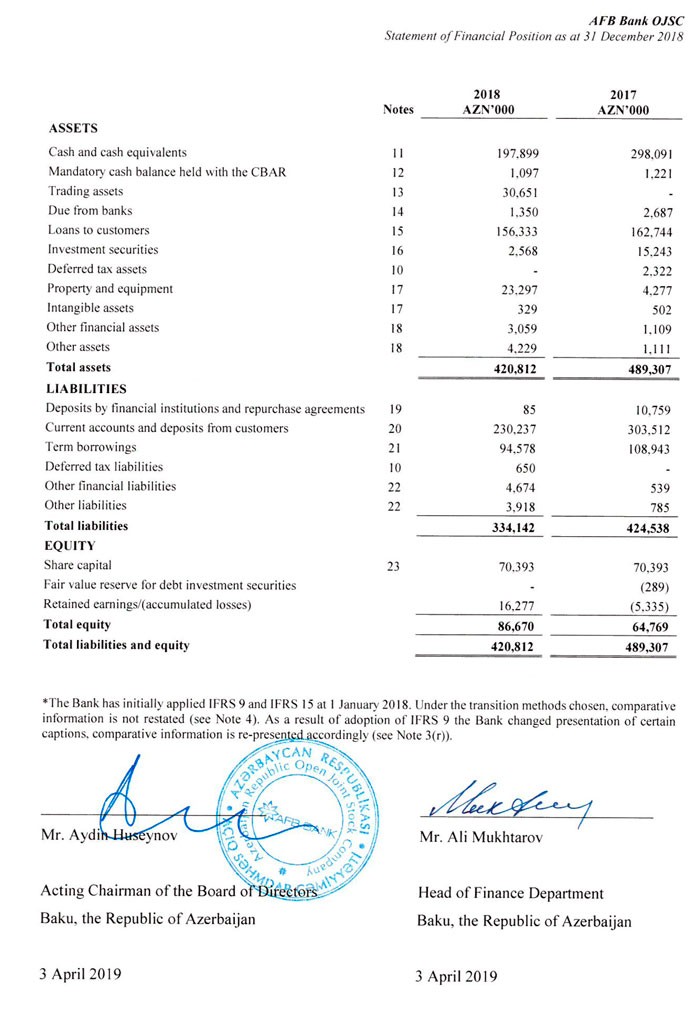 31 Dekabr 2018-ci il tarixində “AFB Bank”ın cəmi aktivləri 420 milyon 812 min manat, o cümlədən müştərilərə verilmiş 156 milyon 33 min manat təşkil edib. 2017-ci ilin sonunda Bankın aktivləri 489 milyon 307 min manat, o cümlədən müştərilərə verilmiş kreditlər 162 milyon 744 min manat təşkil etmişdi.