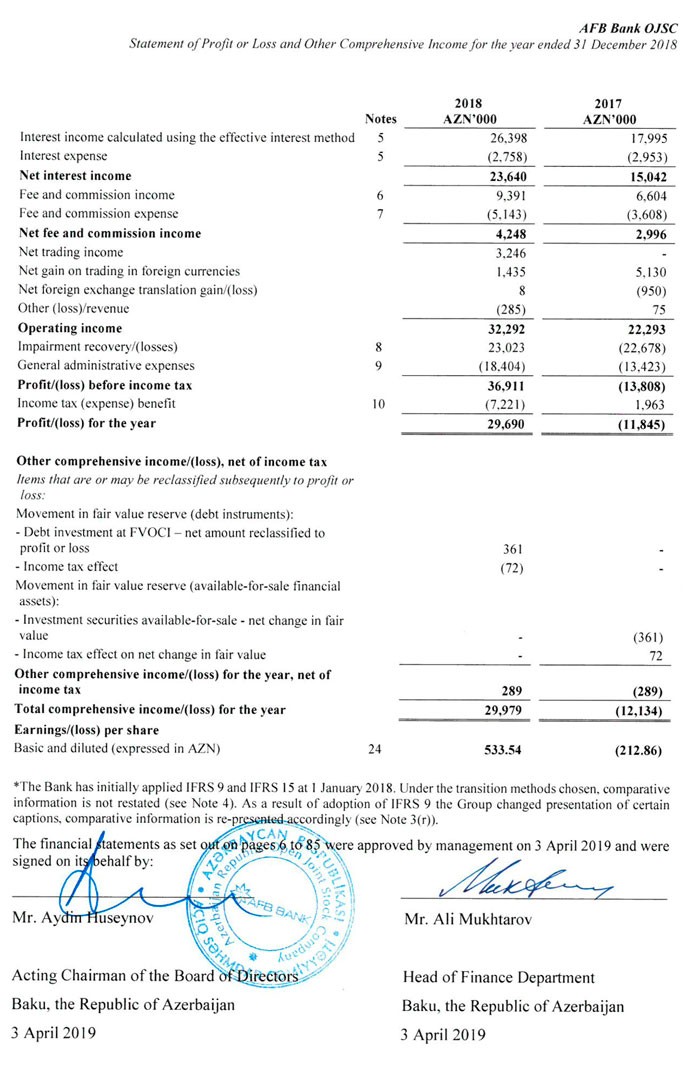 KPMG audti şirkəti “AFB Bank”ın 31 Dekabr 2018-ci il tarixinə bitən il üzrə maliyyə hesabatlarına audit rəyi təqdim edib.