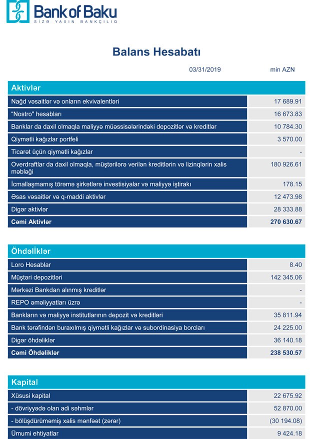“Bank of Baku” ASC 2019-cu ilin 1-ci rübü üzrə maliyyə göstəricilərini açıqlayıb.