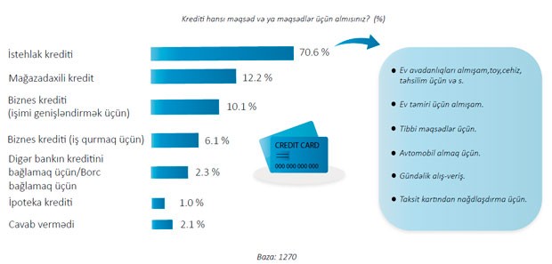 Əhalinin kredit tələbatı təbii olaraq ən çox istehlak istiqamətlidir (70.6%). Biznes üçün götürülən kreditlər isə ümumi kreditlərin 16.2% təşkil edir.