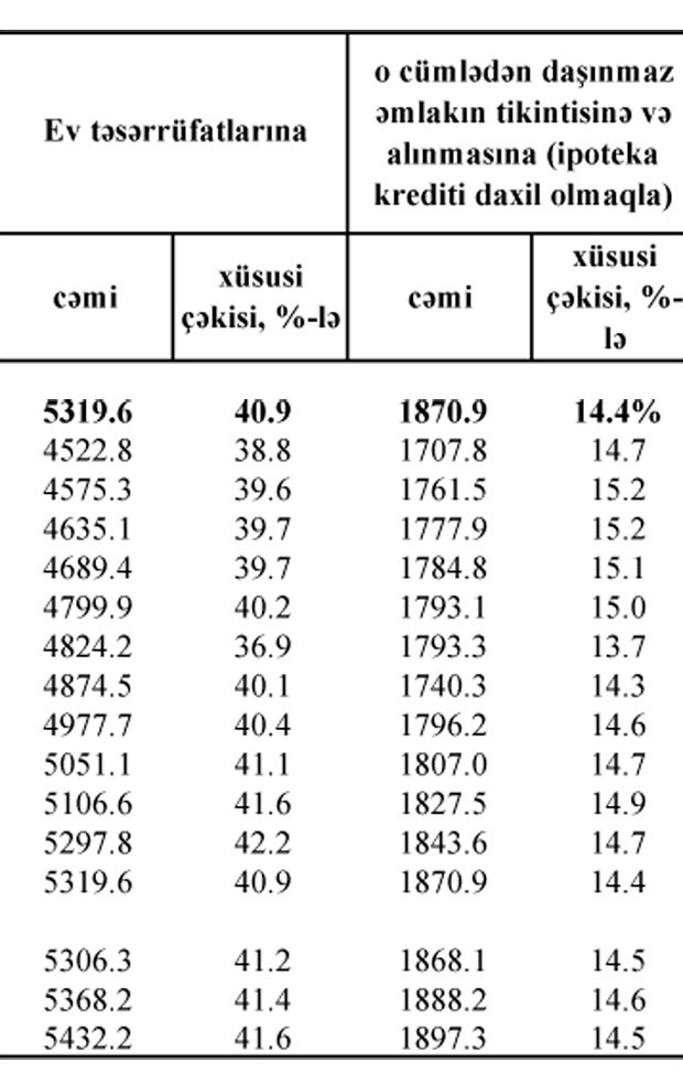 31 Mart 2019-cu il tarixində ev təsərrüfatlarına verilən 5 milyard 432.2 milyon manat kreditin 1 milyard 897.3 milyon manatını daşınmaz əmlakın tikintisinə və alınmasına (ipoteka krediti daxil olmaqla) verilən kreditlər təşkil edib.