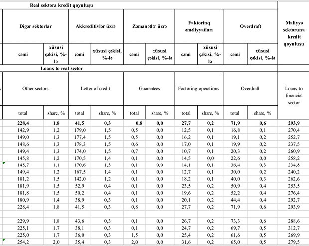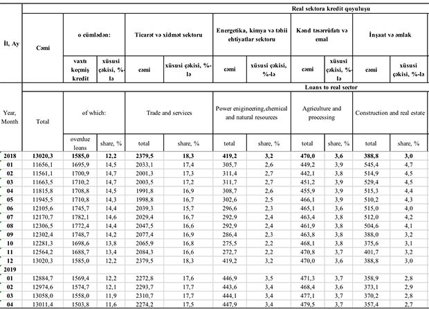 Azalma Apreldə ticarət, xidmət, inşaat, nəqliyyat və rabitə sektorlarına verilən kreditlərin azalması ilə bağlı olub. Mart ayının sonu ilə müqayisədə Apreldə ticarət və xidmət sektoruna verilən kreditlər 36,5 milyon manat azalaraq 2 milyard 274,1 milyon manata, inşaat və əmlak sektoruna verilən kreditlər 12,8 milyon manat azalaraq 357,4 milyon manata, nəqliyyat və rabitə sektoruna verilən kreditlər isə 86 milyon manat artaraq 1 milyard 271,9 milyon manata geriləyib.