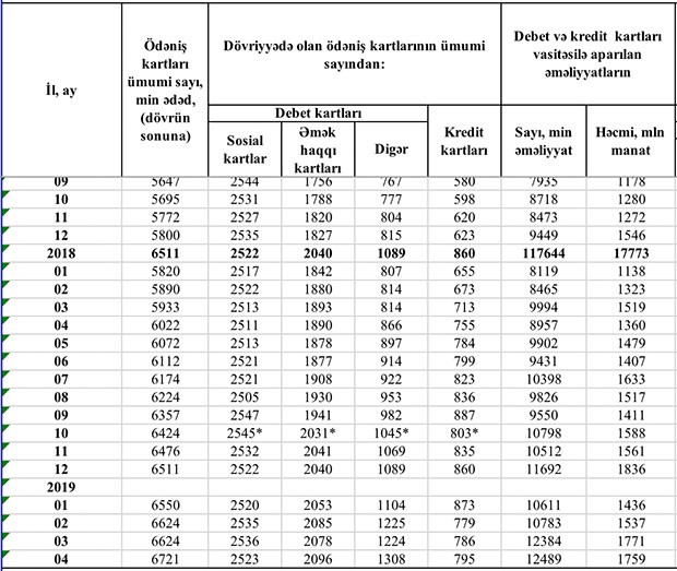 2018-ci ilin sonu ilə müqayisədə isə yanvar-aprel ayları ərzində (ilk 4 ayda) cəmi ödəniş kartlarının sayı 210 min ədəd, o cümlədən sosial kartların sayı 1 min ədəd, əmək haqqı kartlarının sayı 56 min ədəd, sosial kart və əməkhaqqı kartı olmayan digər debet kartlarının sayı isə 219 min ədəd artıb. Kredit kartlarının sayı isə 65 min ədəd azalıb.