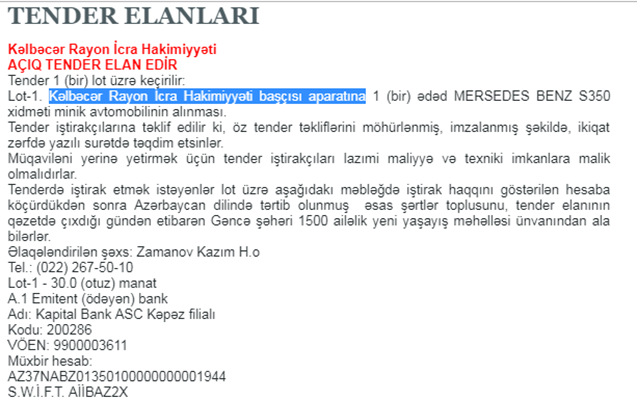 Qeyd edək ki, 2013-cü ilin martından Kəlbəcərin icra başçısı olan Aqil Məmmədovun istədiyi “Mercedes Benz S 350” markalı avtomobilin satış qiyməti 250 min manat civarındadır.