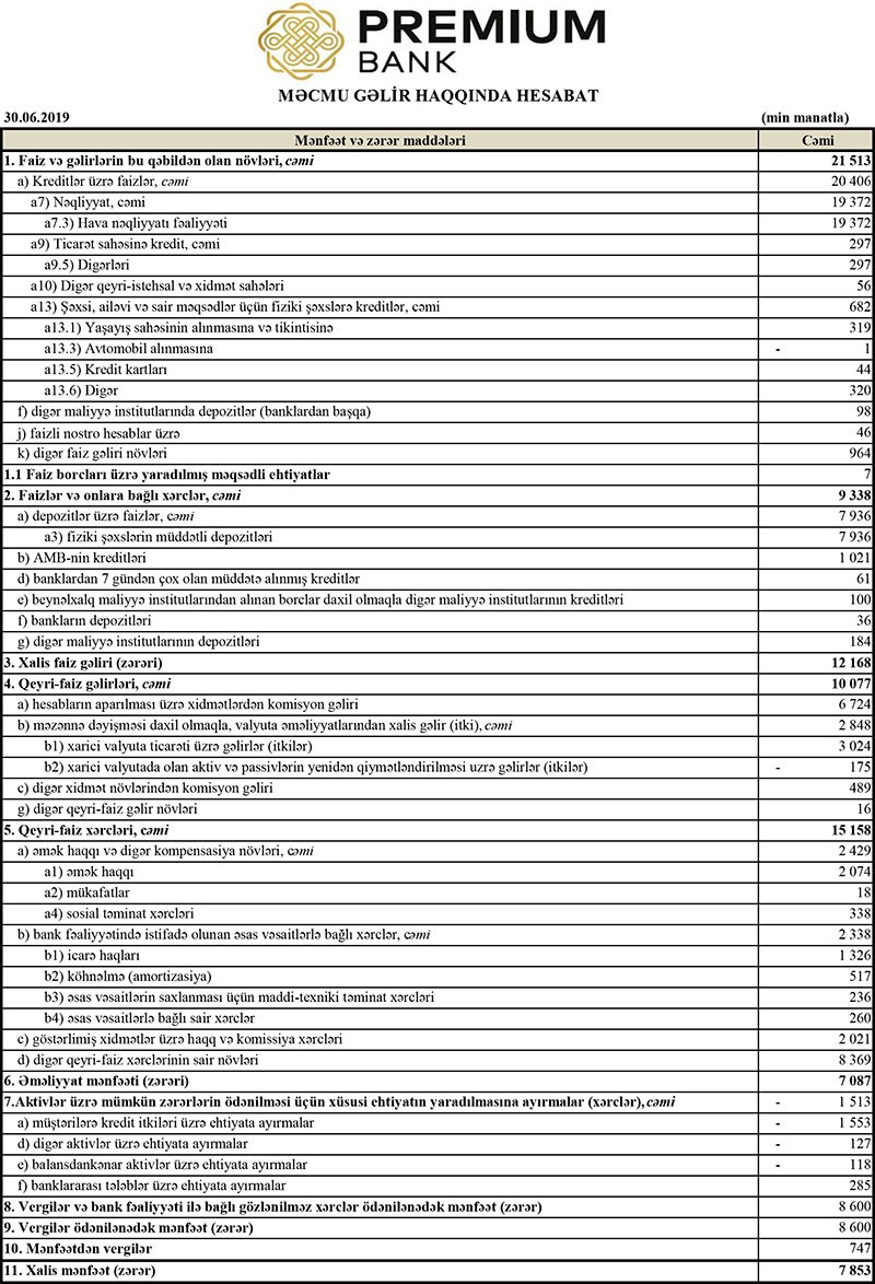 “Premium Bank” ASC 2019-cu ilin 1-ci yarısını (yanvar-iyun dövrünü) 7 milyon 853 min manat xalis mənfəət ilə başa vurub. Bu, 2018-ci ilin eyni dövrü ilə müqayisədə 36% azdır. “Premium Bank” ötən ilin 1-ci yarısını 12 milyon 256 min manat xalis mənfəətlə bağlamışdı. Xalis mənfəətin düşməsi ehtimal olunan kredit və depozit itkiləri üzrə yaradılan ehtiyatdan azad olan vəsaitin 5 dəfə azalması ilə bağlıdır. Mühüm olan, Bankın əməliyyat mənfəətinin artmasıdır.