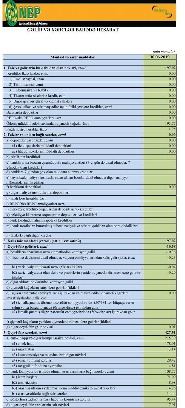 Pakistan Milli Bankının Bakı Filialı 2019-cu ilin 1-ci yarısını 252 min manat zərər ilə başa vurub.
