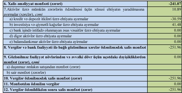 186 min manat cəmi gəlirə qarşı bankın cəmi xərcləri 428 minmanat təşkil edib. Eyni zamanda ehtiyatdan 11 min manat azad olub. Nətcədə filial ilk 6 ayı 252 min manat zərər ilə bağlayıb.