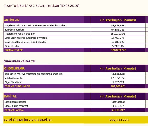 30 İyun 2019-cu il tarixində “Azər-Türk Bank” 336 milyon 9 min manat cəmi aktivlərə malik olub. 30 İyun 2018-ci il tarixində Bankın cəmi aktivləri 313 milyon 744 min manat təşkil etmişdi.