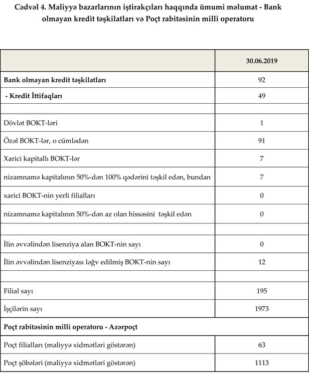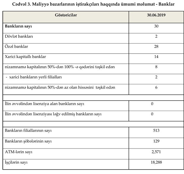 Fəaliyyət göstərən 30 bankın filiallarının sayı 513, şöbələrinin sayı 129, ATM-lərin sayı 2,571 olub. Bank sektorunun işçi heyətinin sayı cari ilin 6 ayında 5% (873 nəfər) artaraq 18,288 nəfər təşkil edib.
