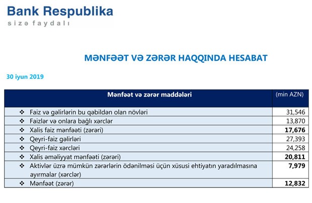 "Bank Respublika" 2019-cu ilin birinci yarımilliyinə dair maliyyə hesabatlarını açıqlayıb.
