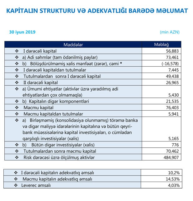 Hesabata əsasən, ötən ilin analoji dövrü ilə müqayisədə Bankın xalis faiz mənfəəti 1,8 dəfə artaraq 17 milyon 670 min manat, xalis əməliyyat mənfəəti isə 7,4 dəf artaraq 20 milyon 810 min manat, xalis mənfəəti isə 20 dəfədən çox artararq 12 milyon 830 min manat təşkil etmişdir.