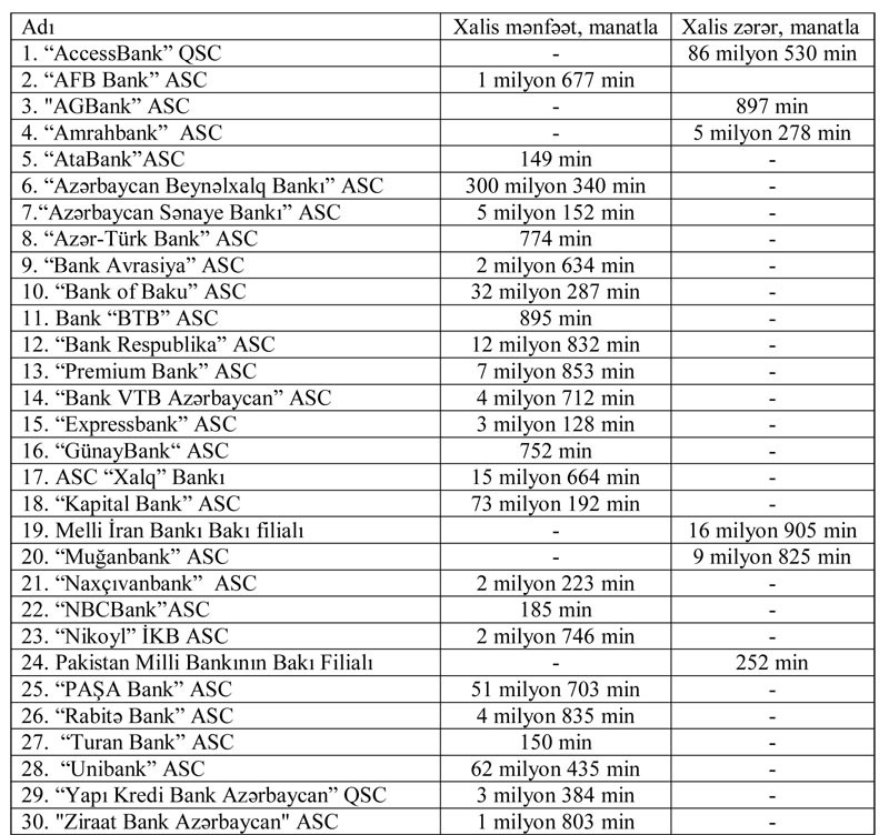 24 bank mənfəət, 6 bank zərər açıqladı - SİYAHI