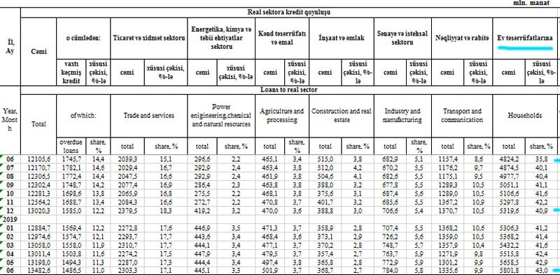 Cari ilin 1-ci yarısında cəmi kredit qoyuluşları 462,3 milyon manat, ev təsərrüfatlarına verilən kreditlər isə 482,2 milyon manat artıb. Cəmi kredit qoyuluşlarının onun tərkib hissəsi olan ev təsərrüfatlarına verilən kreditlərdən az artması ilin ilk yarısında biznes kreditlərinin azaldığına işarədir.