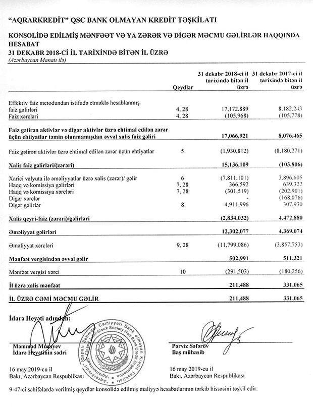 Müqayisə üçün qeyd edək ki, 2017-ci ildə “Aqrarkredit”in cəmi gəlirləri 13 milyon 26 min manat cəmi xərcləri isə 12 milyon 695 min manat təşkil etmişdi.