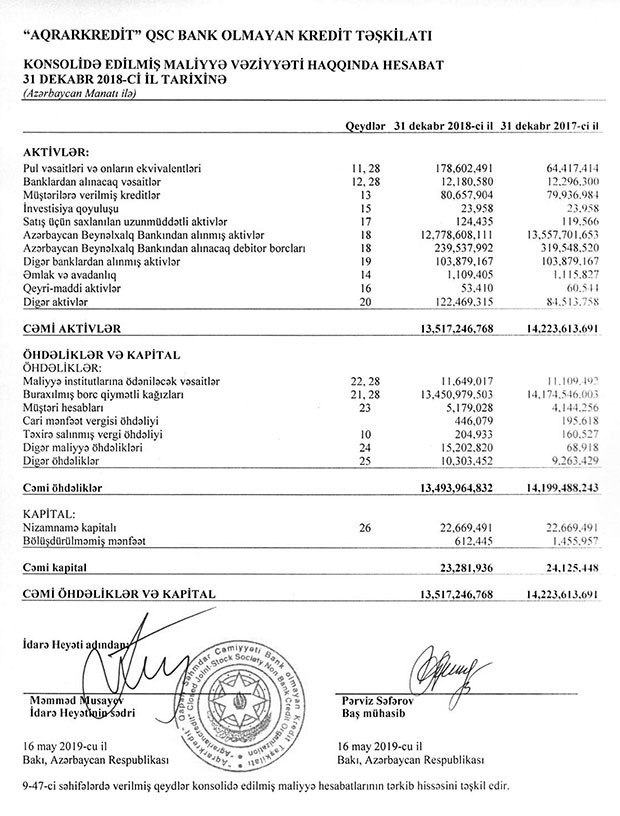 31 dekabr 2018-ci il tarixində “Aqrarkredit” 13 milyard 494 minlyon manat cəmi öhdəliklərinin 13 milyard 451 milyon manatını buraxılmış borc qiymətli kağızları təşkil edib. İlin sonunda “Aqrarkredit” 23 milyon 282 min manat cəmi kapitala malik olub.