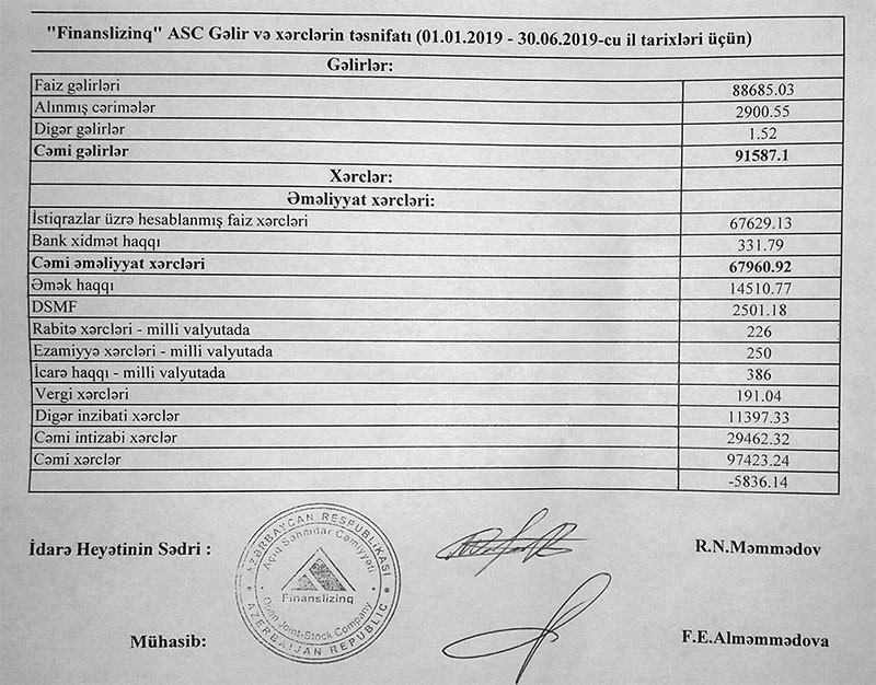 2 milyon 530 min manat cəmi aktivləri olan “Finans Lizinq” 2019-cu ilin 1-ci yarısını 5863 manat zərər ilə başa vurub.