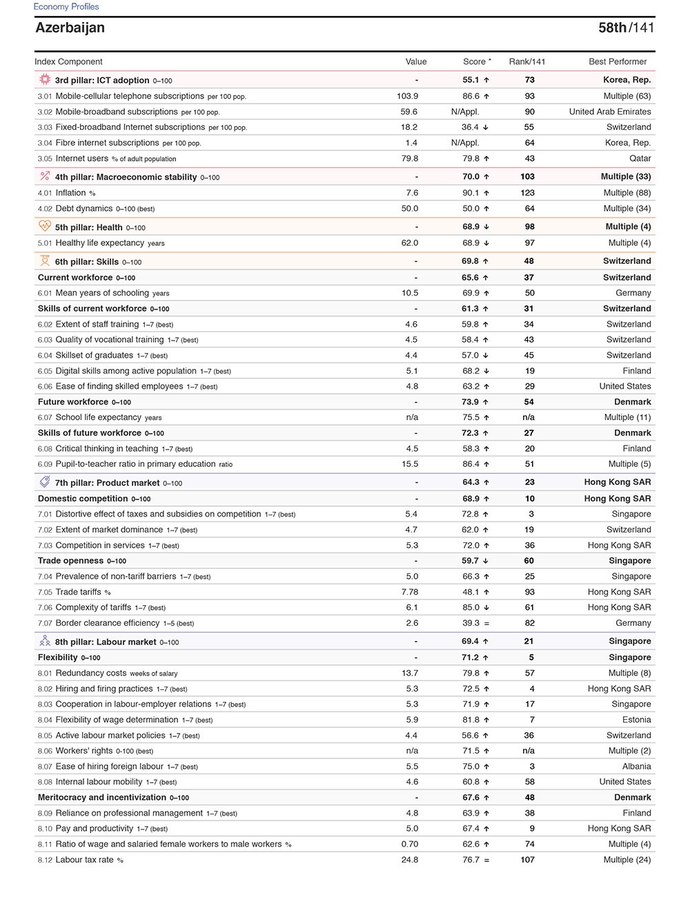 Azərbaycan Ümumdünya İqtisadi Forumunun 2019-cu il üzrə qlobal rəqabətə davamlıq reytinqində 11 pillə irəliləyib.