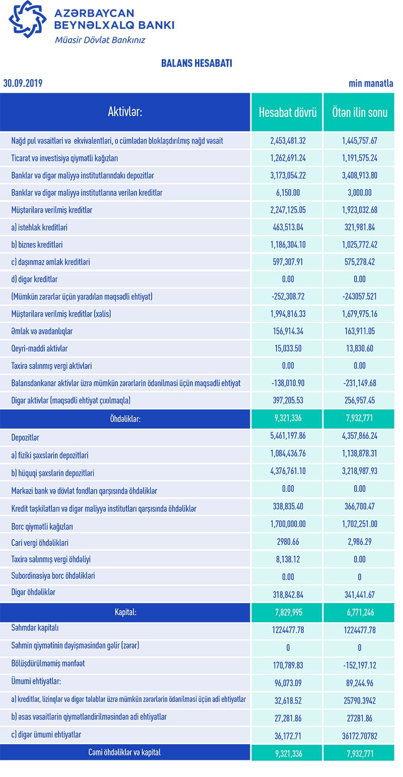 30 Sentyabr 2019-cu il tarixində “Azərbaycan Beynəlxalq Bankı” ASC 9 milyard 321 milyon 336 min manat cəmi aktivlərə malik olub. Bankın cəmi aktivləri ötən ilin sonu ilə müqayisədə 1 milyard 388 milyon 565 min manat və ya 17,5% artıb.