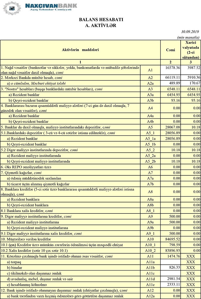 “Naxçıvanbank”ın cəmi aktivləri 200 milyon manat səviyyəsini aşaraq 209 milyon 361 min manata çatıb. 30 Sentyabr 2019-cu il tarixindı Bank 83 milyon 58 min manat cəmi kapitala malik olub.