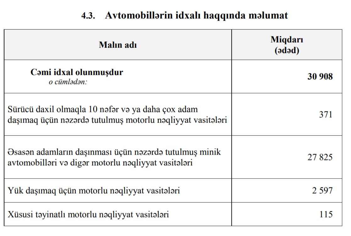 O cümlədən, 2019-cu ilin Yanvar-Sentyabr aylarında Azərbaycana 27 min 825 ədəd minik avtomobili, 371 ədəd avtobus, 2 min 597 ədəd yük avtomobili və 115 ədəd xüsusi təyinatlı vasitə idxal olunub.