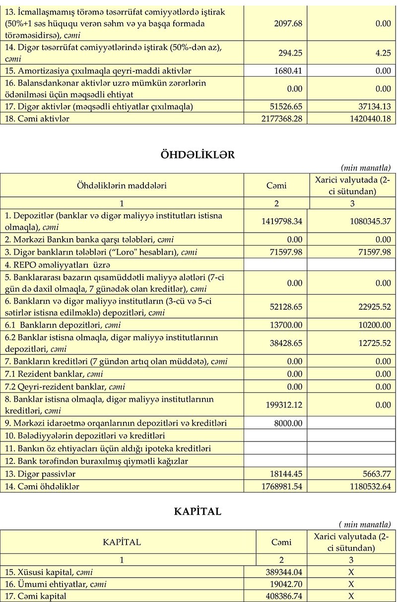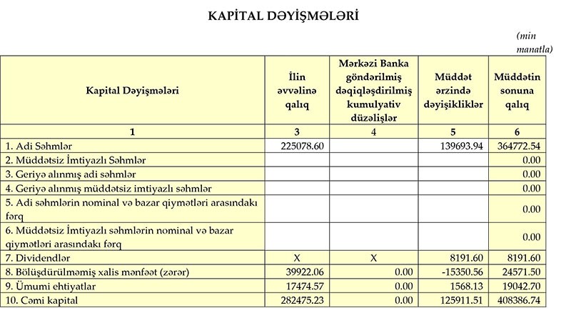 Bankın cəmi kapitalı сari ilin 9 ayı ərzində 125 milyon 910 min manat (44.57%) artaraq 408 milyon 30 min manata çatıb, nizamnamə kapitalı isə 364 milyon 770 min manat təşkil edib", - Bankın məlumatında deyilir
