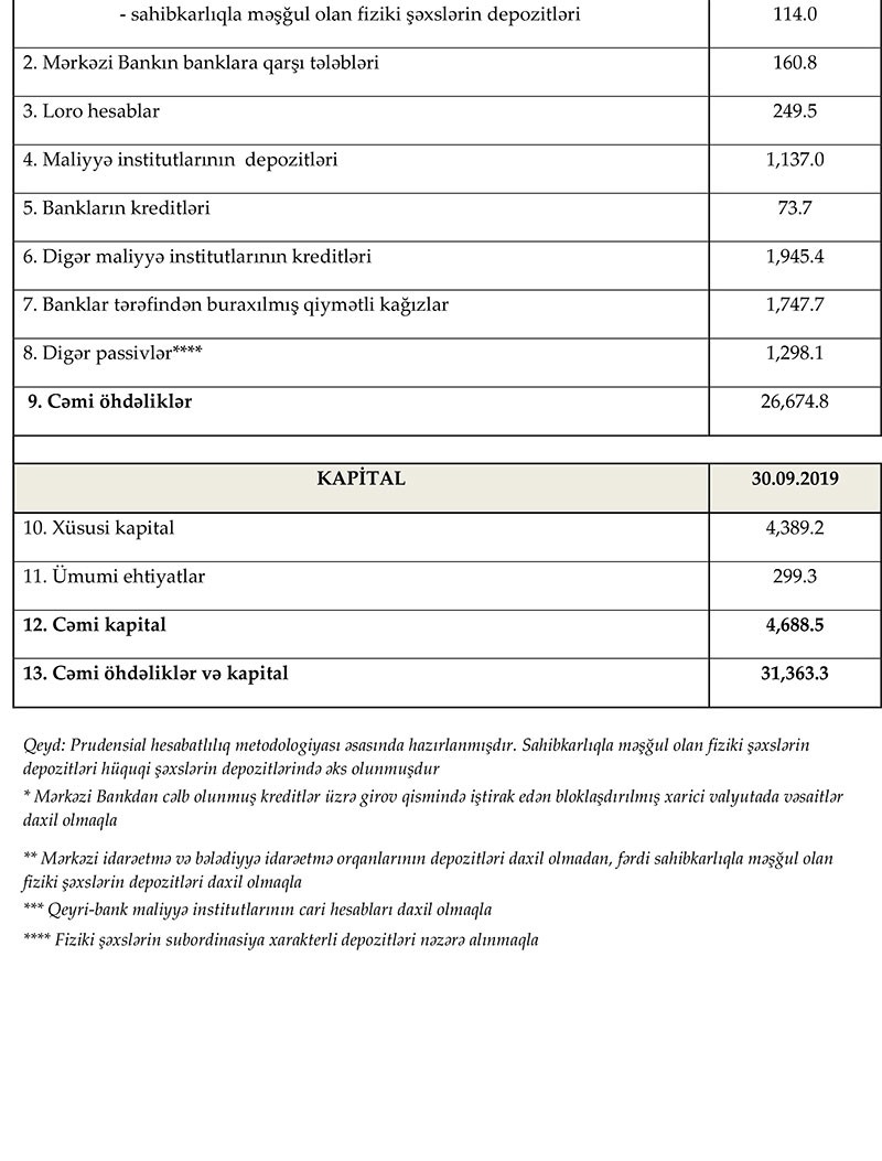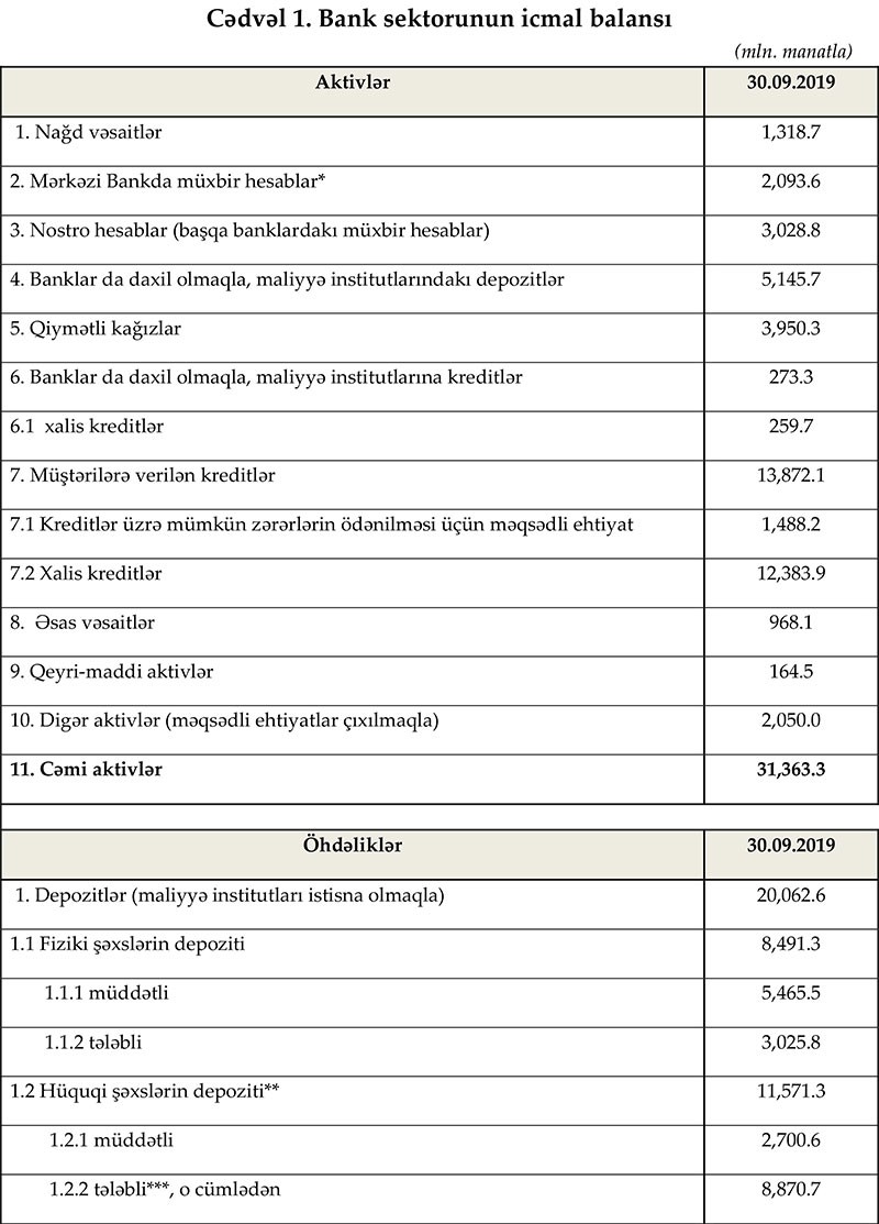 Maliyyə Bazarlarına Nəzarət Palatasının yaydığı press-relizdə bildirilir ki, 30 sentyabr 2019-cu il tarixinə Azərbaycanda fəaliyyət göstərən bankların cəmi aktivləri 31 milyard 363 milyon manat, cəmi öhdəlikləri isə 26 milyard 675 min manat təşkil edib. Sektorun balans kapitalı 4 milyard 686 milyon manat olub.