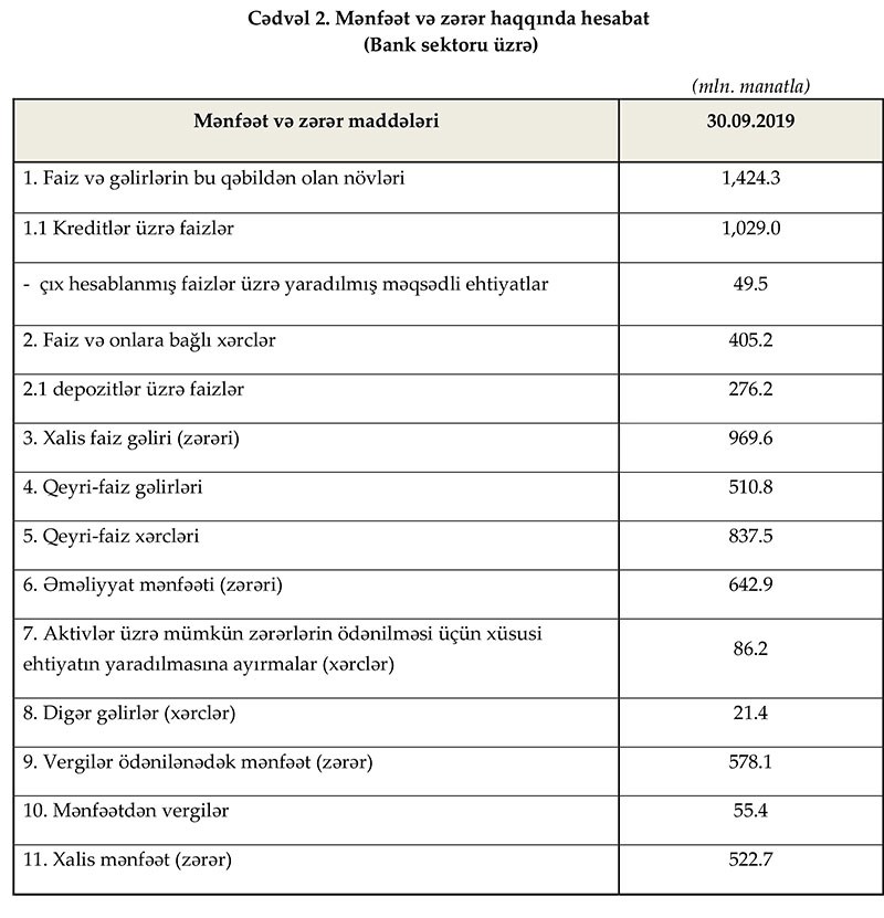 2019-cu ilin 9 ayı ərzində bank sektoru 645.7 milyon manat əməliyyat mənfəəti generasiya edib. Sektorun xalis mənfəəti isə 522.7 milyon manat təşkil edib. Ötən ilin müvafiq dövrü ilə müqayisədə faiz gəlirləri 10.6%, kreditlər üzrə faiz gəlirləri isə 14.4% artmışdır.
