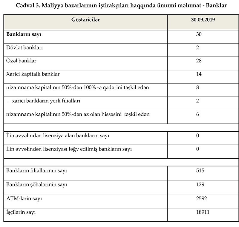 Fəaliyyət göstərən 30 bankdan 14-ü xarici kapitallıdır, bunlardan 7-də xarici kapitalın payı 100% təşkil edir. 30 bankın filiallarının sayı 515, şöbələrinin sayı 129, ATM-lərin sayı 2,592 olub. Bank sektorunun işçi heyətinin sayında artım sentyabr ayında da davam etmişdir. Belə ki, 2019-cu ilin 9 ayı ərzində işçi sayı 8.6% (1496 nəfər) artaraq 18 min 911 nəfər təşkil edib.