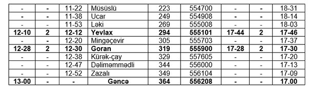 Məlumata görə, gündüz vaxtının qısalması səbəbindən və sərnişinlərin müraciətlərini nəzərə alaraq, “Azərbaycan Dəmir Yolları” QSC həmin istiqamətdə qatarların qrafikini yeniləyib. 702/701 nömrəli qatar Bakıdan saat 08:45-da yola düşəcək, saat 13:00-da Gəncəyə çatacaq. Gəncədən saat 17:00-da yola düşən qatar isə saat 21:15-də Bakıda olacaq.