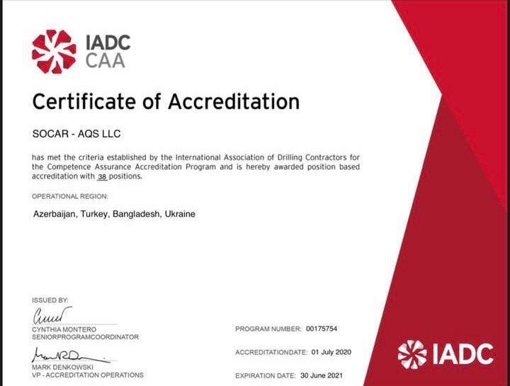 SOCAR AQŞ Beynəlxalq Qazma Podratçıları Assosiasiyasının Səriştəliliklərin Qiymətləndirilməsi proqramının beynəlxalq standartlara uyğun akkreditasiyasını alıb.