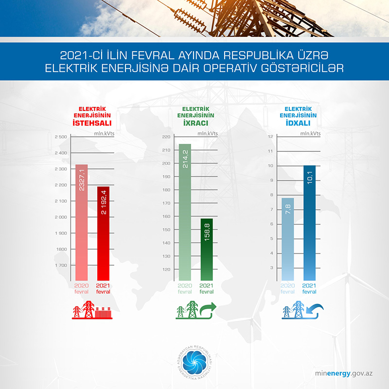 Energetika Nazirliyinin yaydığı məlumata görə, cari ilin fevral ayında respublika üzrə elektrik enerjisinin istehsalı 2192,4 mln. kVt·st, ixracı 158,8 mln. kVt·st, idxalı isə 10,1 mln. kVt·st olub.