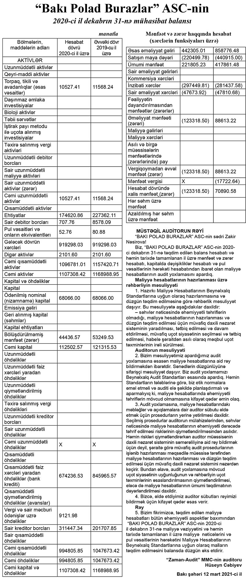 Burazların (tros) istehsalı ilə məşğul olan “Bakı Polad Burazlar” ASC 2020-ci ili 123 min 318 manat xalis zərər ilə başa vurub. Halbuki, şirkət 2019-cu ili 70 min 890 manat xalis mənfəət ilə bağlamışdı.