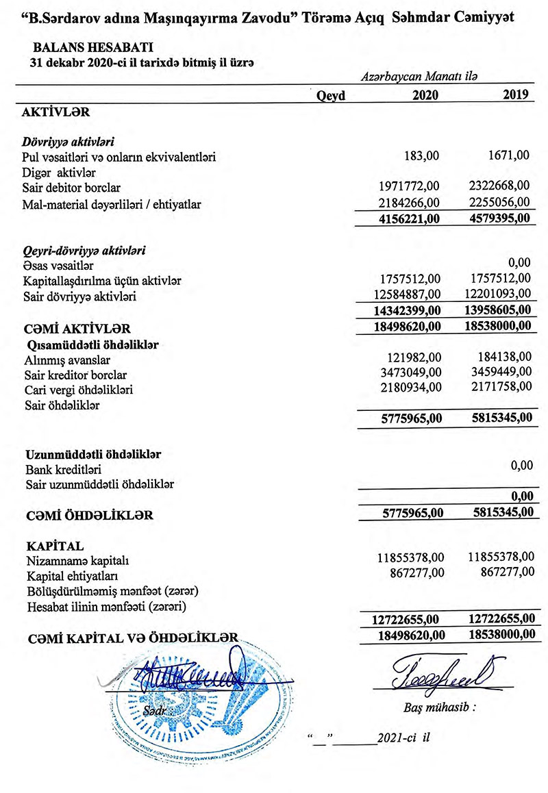 "B.Sərdarov adına Maşınqayırma Zavodu" TASC 2020-ci ili 407 min manat xalis zərər ilə başa vurub. Müəssisə 2019-cu ili 87 min 300 manat xalis mənfəət ilə bağlamışdı.
