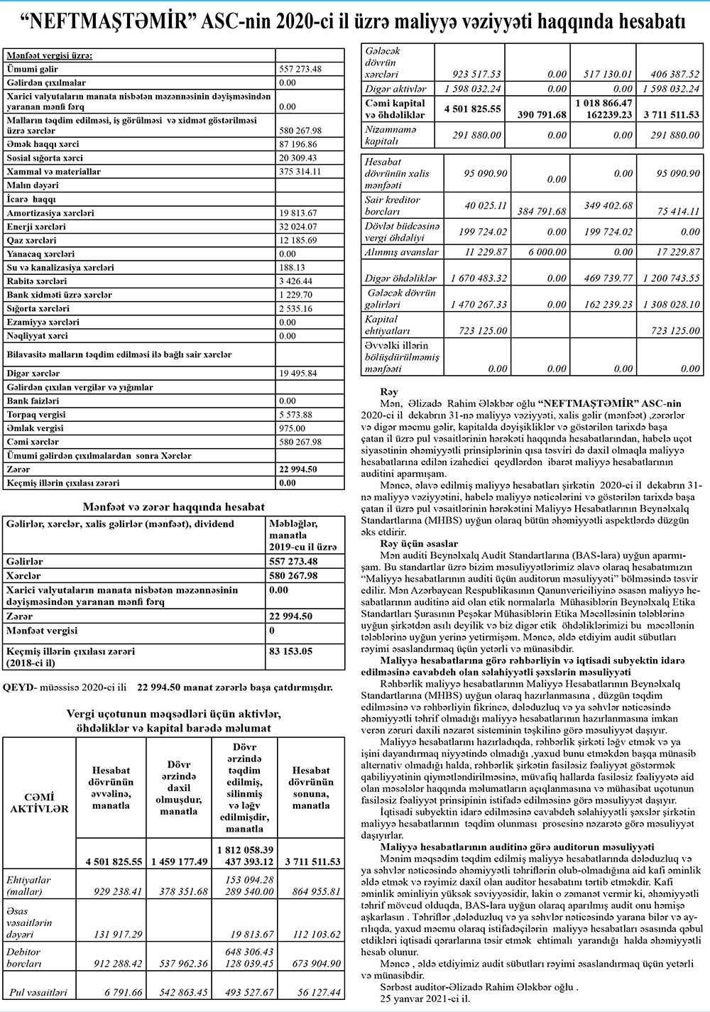 “Neftmaştəmir” ASC-nin 2020-ci ili 22 min 994 manat xalis zərər ilə başa vurub və şirkətin yığılmış zərəri 83 min 153 manata yüksəlib.