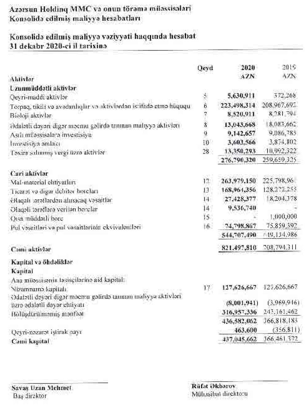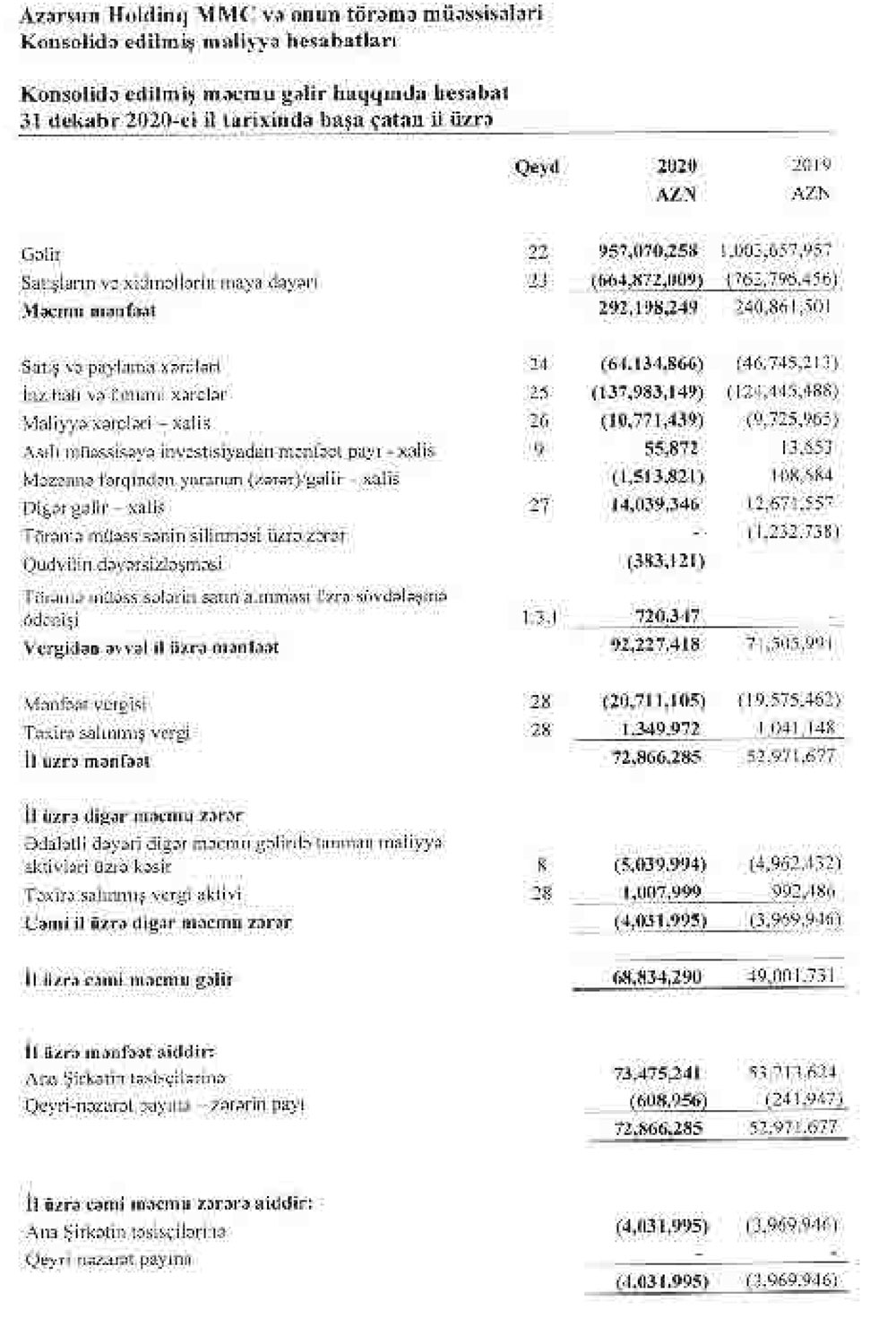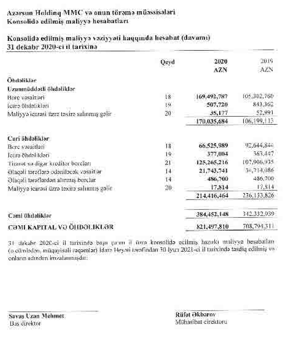 "Azərsun Holdinq" MMC və onun törəmə müəssisələrinin konsolidə edilmiş maliyyə hesabatına görə, bu, 2019-cu illə müqayisədə 37,55% çoxdur. “Azərsun Holdinq” 2019-cu ili 52 milyon 972 min manat xalis mənfəət ilə bağlamışdı.