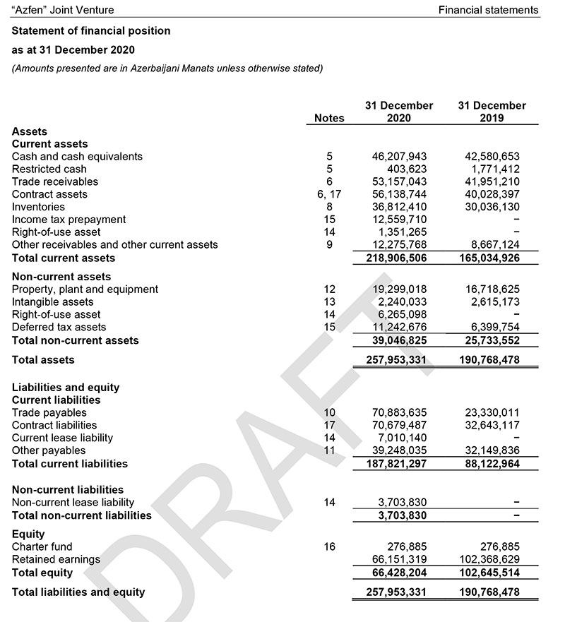 31 Dekabr 2020-ci il tarixində “Azfen” birgə müəssisəsi 257 milyon 953 min manat cəmi aktivlərə malik olub. Şirkət 2019-cu ilin sonunda 190 milyon 768 min manat cəmi aktivlərə malik idi (aktivləri 35,2% artıb).