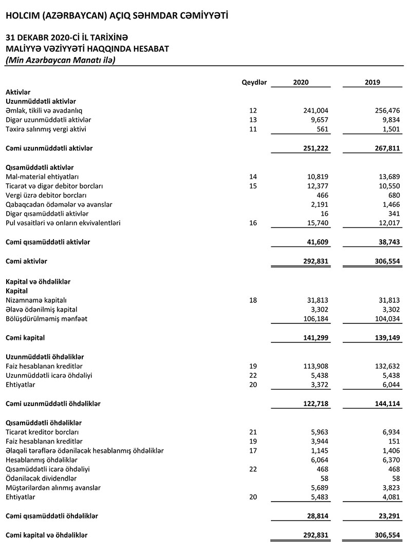 Müqayisə üçün qeyd edək ki, 2019-cu ildə “Holcim Azərbaycan”ın cəmi gəlirləri 128 milyon 402 min manat, cəmi xərcləri isə 119 milyon 248 min manat təşkil etmişdi. 2019-cu ildə “Holcim Azərbaycan” məzənnə fərqi üzrə, maliyyə aktivləri üzrə ehtiyatlarda dəyişikliklərdən və vergi ehtiyatında dəyişikliklər üzrə də gəlirlər əldə etmişdi. 2020-ci ildə bu gəlirlər olmayıb.