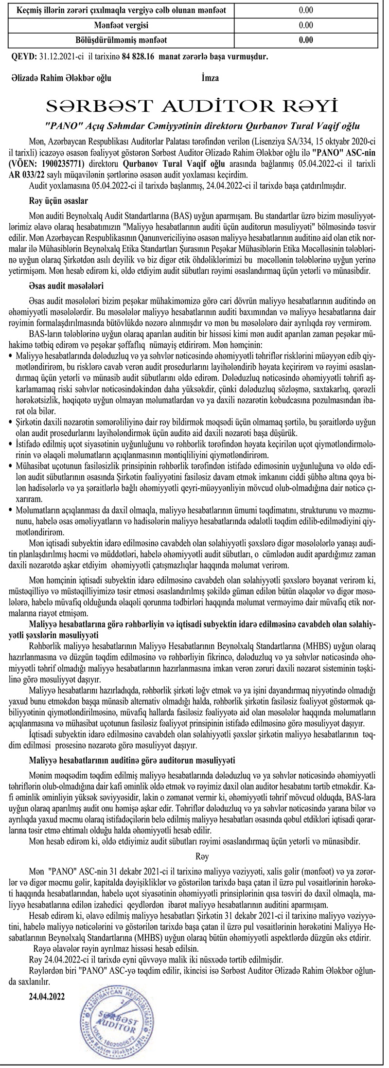 Fasad, qapı və pəncərə profillərinin istehsalı ilə məşğul olan “PANO” ASC 2021-ci ili təxminən 85 min manat xalis zərər ilə başa vurub.