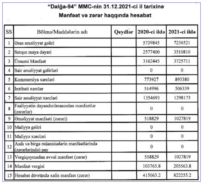 Marja.az xəbər verir ki, "Dalğa-94"ün 2020-ci ildə satışdan gəlirləri 5 milyon 740 min manat ikən, 2021-ci ildə 7 milyon 236 min manat təşkil edib (1 milyon 497 min manat və ya 20,6% artıb).