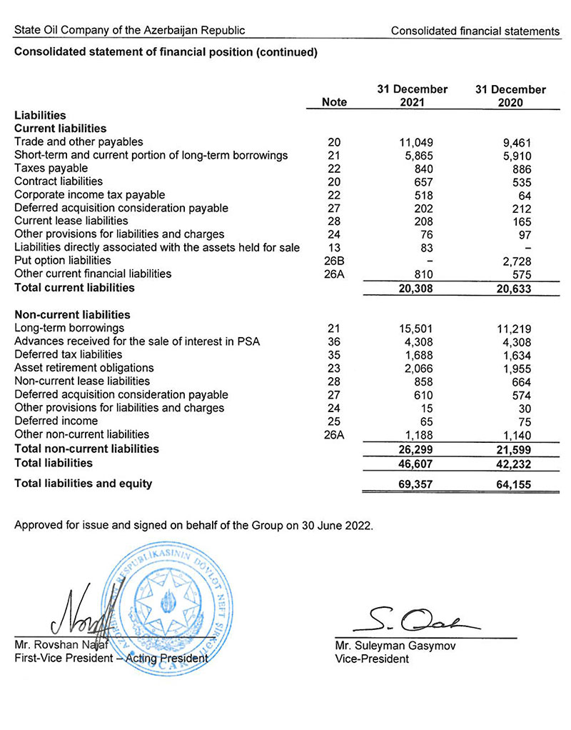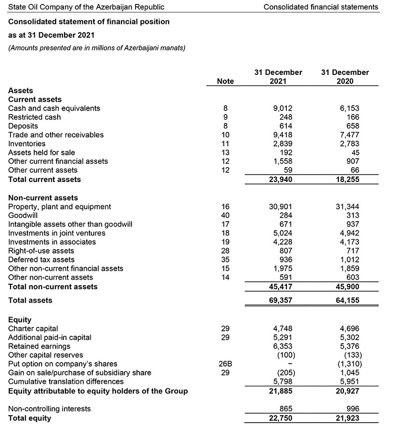 Hesabat ilində SOCAR-ın cari aktivləri 31,1% artaraq 23,9 milyard manata çatıb, cari öhdəlikləri isə 1,6% azalaraq 20,3 milyard manatadək azalıb. Şirkətin ümumi aktivləri 8,1%-lik artımla 69,4 milyard manata yüksəlib.