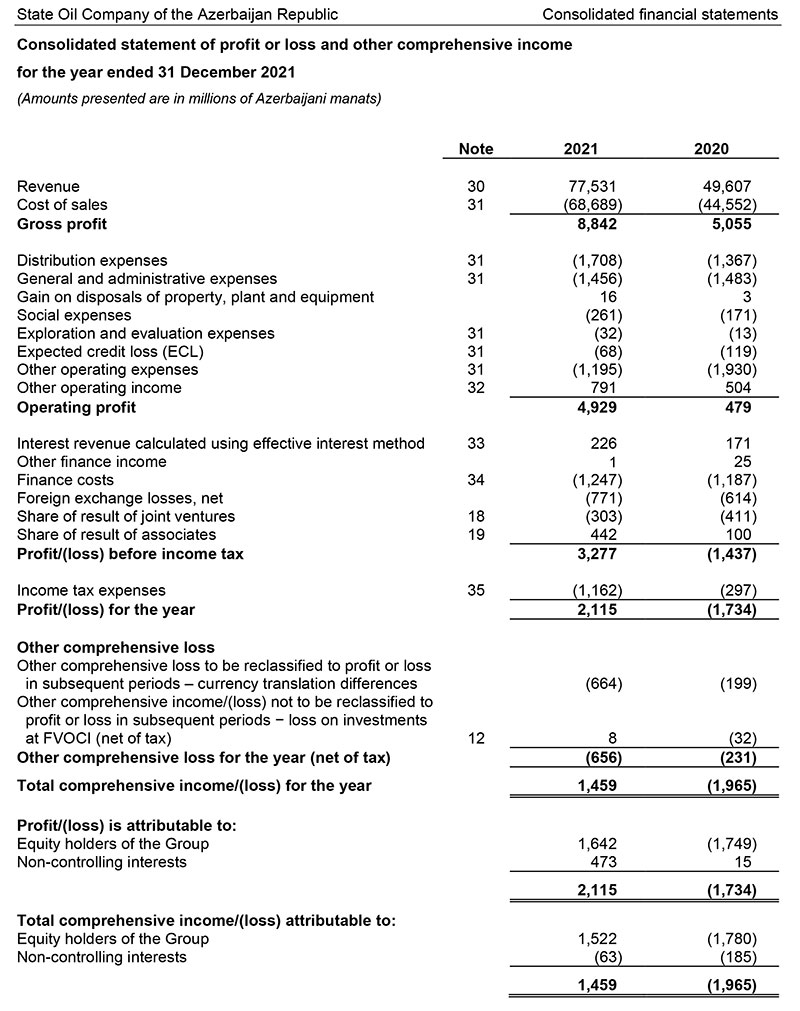 SOCAR 2021-ci ili 2 milyard 115 milyon manat xalis mənfəətlə başa vurub. Bu, şirkətin konsolidasiya olunmuş maliyyə hesabatlarının hazırlanmağa başladığı 2008-ci ildən etibarən ən yüksək göstəricidir.