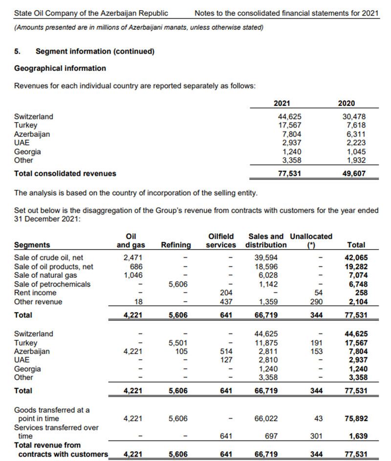 2021-ci ildə SOCAR satışdan 77 milyard 531 milyon manatlıq cəmi gəlirlərinin 54,2%-ni İsveçrədə əldə edib.