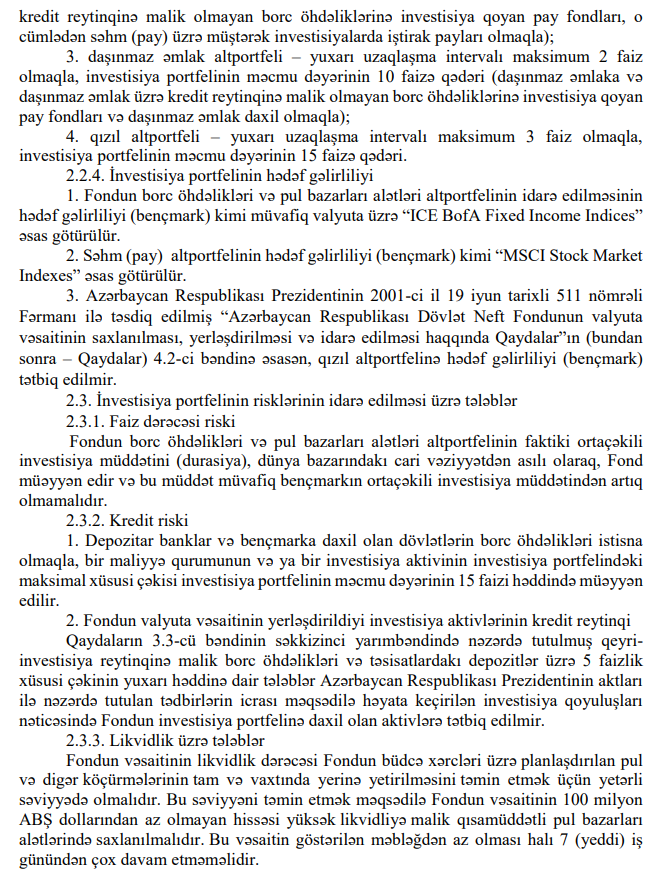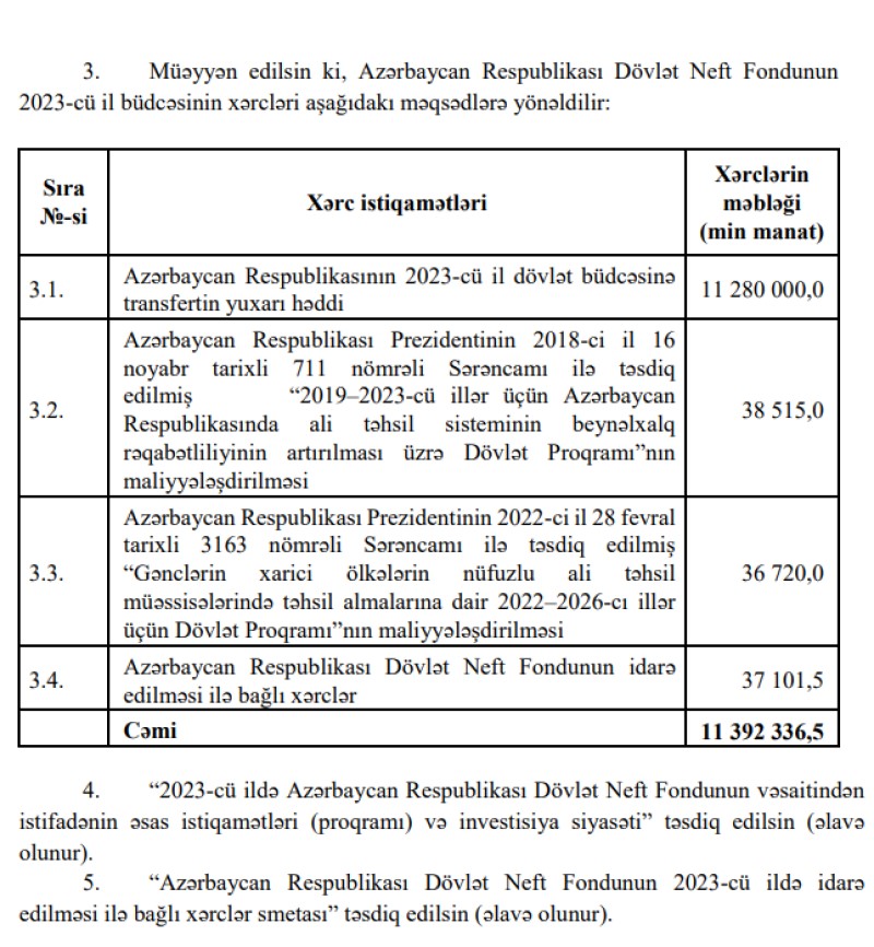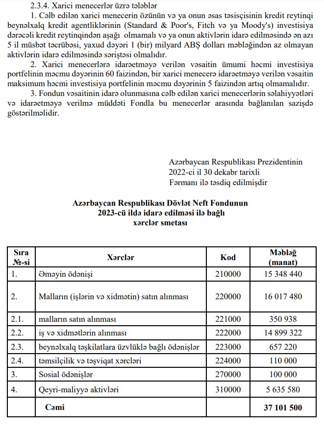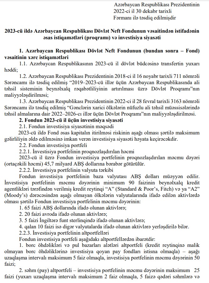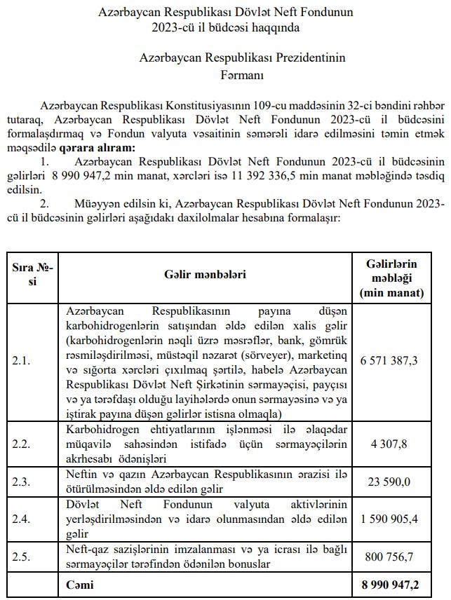 Azərbaycan Respublikası Dövlət Neft Fondunun 2023-cü il büdcəsinin gəlirləri 8 milyard 990 milyon 947,2 min manat, xərcləri isə 11 milyard 392 milyon 336,5 min manat məbləğində təsdiq edildi. edilsin.Prezident İlham Əliyev Dövlət Neft Fondunun (ARDNF) 2023-cü il büdcəsini təsdiq edib.