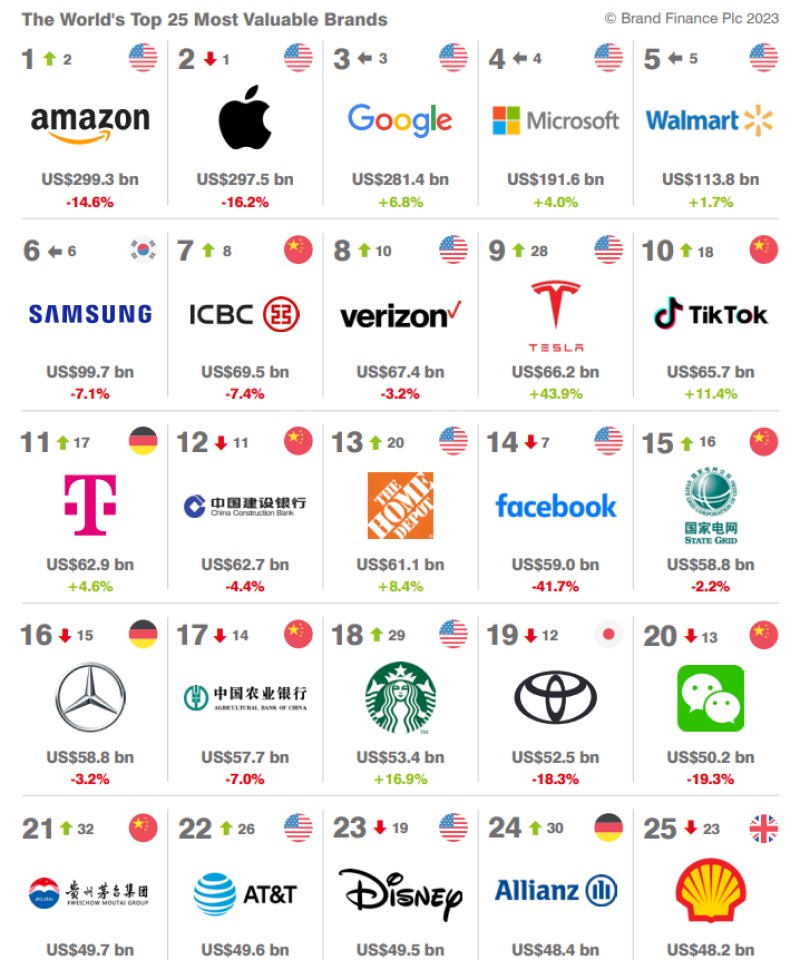Reytinqdə üçüncü yerdə Google (281,4 milyard dollar), dördüncü yerdə Microsoft (191,6 milyard dollar), beşinci yerdə isə Walmart (113,8 milyard dollar) qərarlaşıb.